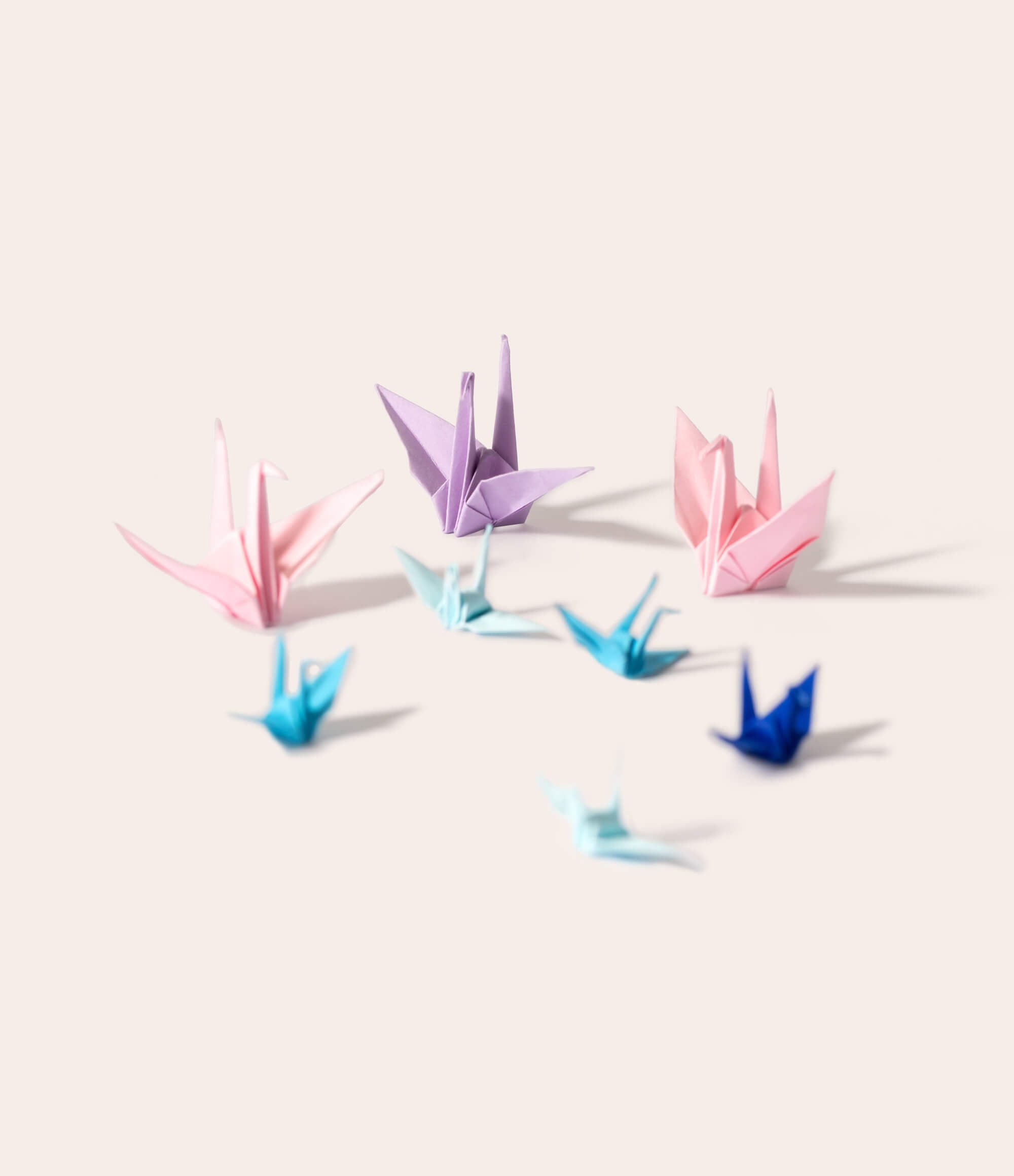 Fünf Origami-Kraniche sind in diesem Set enthalten, bestehend aus zwei großen Kranichen und drei kleinen Kranichen. Die kleinen Kraniche haben Abmessungen von 2 x 3,5 cm, während die großen Kraniche die Maße 3,5 x 7,5 cm aufweisen. Jeder Kranich wurde sorgfältig von Hand gefaltet. Die Farbpalette umfasst eine Mischung aus Blau, Türkis, Rosa und Weiß. Die genaue Farbauswahl erfolgt zufällig