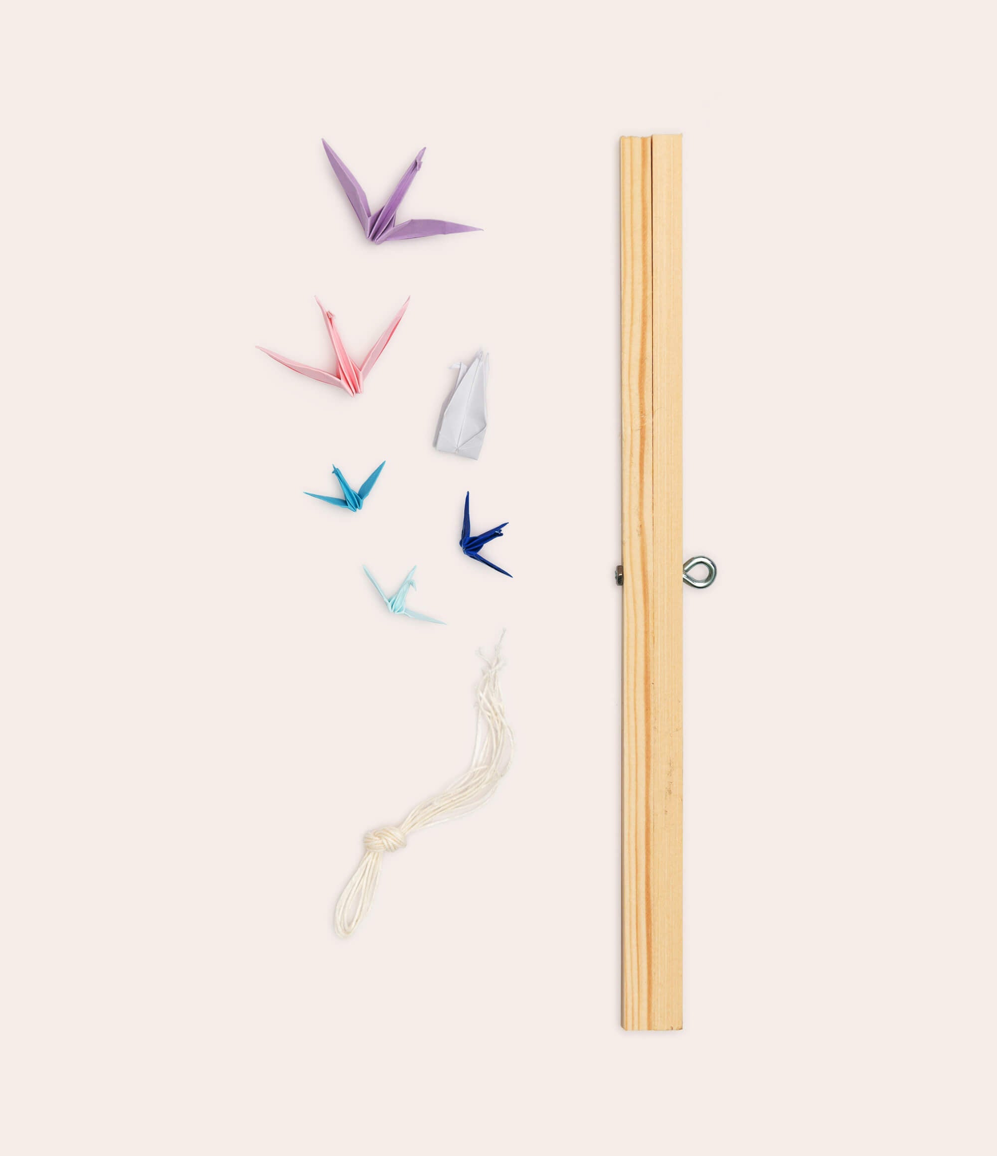 Ein handgefertigter Mobile-Bausatz, bestehend aus zwei Kiefernleisten (Länge 30 cm, Durchmesser 9 mm), Haken zur Befestigung, 8 Schnüren und 5 handgefalteten Origami-Kranichen in verschiedenen Farben und Größen. Geeignet für Kinder ab 5 Jahren.