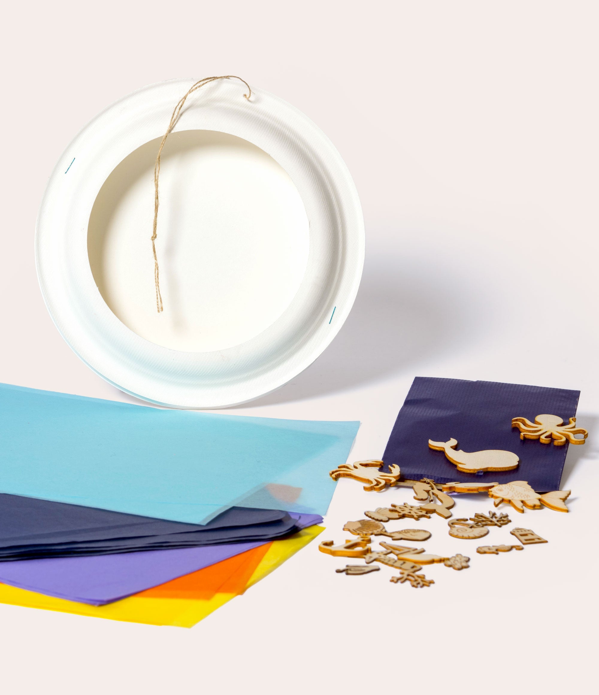 Das Set enthält einen Papprahmen, Seidenpapier, verschiedene Holzformen sowie eine Lichterkette.