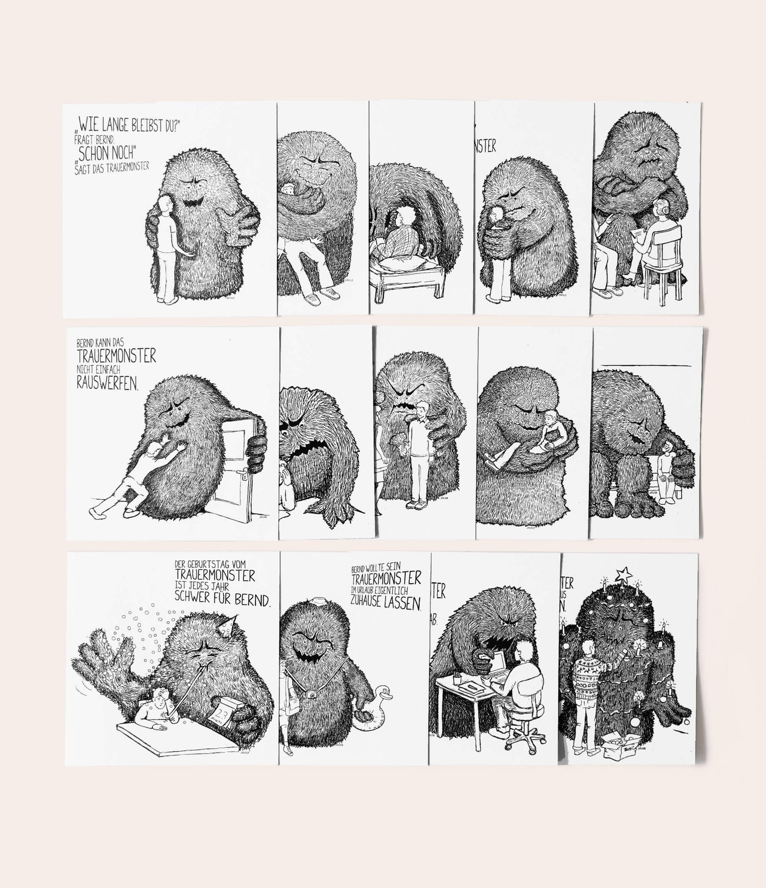 Die komplette Trauermonster-Party bei dir zuhause! Das Trauermonster wird von uns nicht als bösartige Kreatur betrachtet. Im Gegenteil, es hilft dabei, die eigene Trauer in all ihren Facetten und im Kontext des täglichen Lebens zu verstehen.