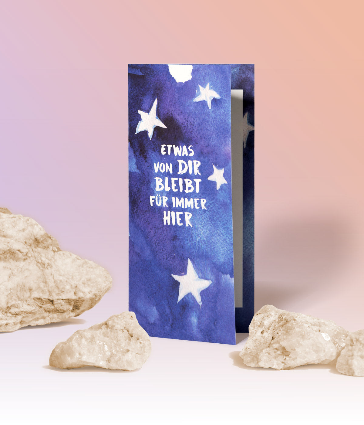 Zur Beerdigung, zum Jahrestag, als Erinnerung, zum Geburtstag der Verstorbenen (und an jedem Tag dazwischen) macht eine Karte Freude und schenkt Angehörigen und Trauernden Kraft.